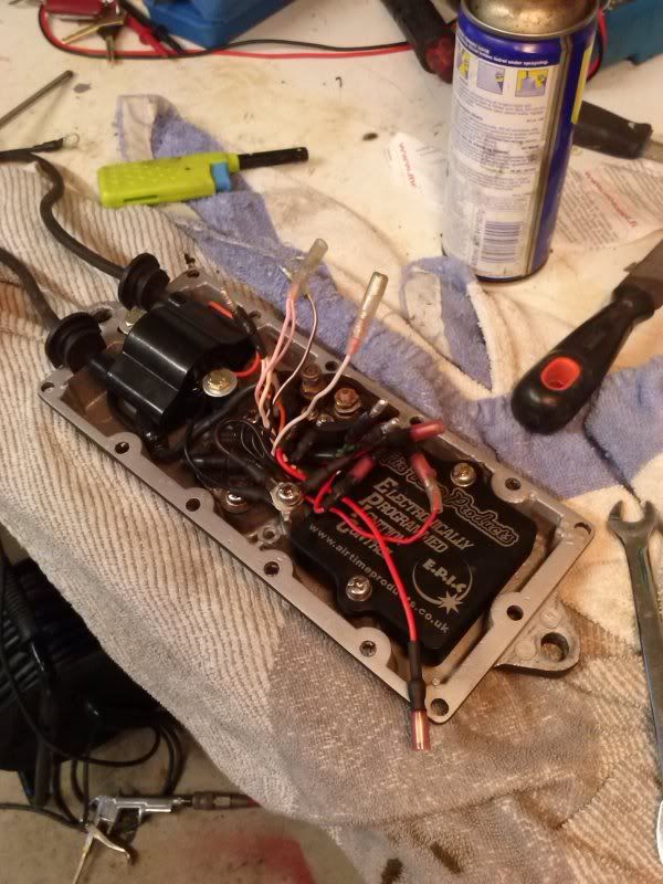 Ebox on saanut joskus vettä jonka seurauksena vaihdettu ATP:n E.P.I.C. CDI boxi ja uusi puola, solenoidi ja jännitteensäädin vaikuttavat olevan vanhoja ja hapetuneita. Ongelmana oli aluksi ettei peli startannut ja oletin vian olevan startin solenoidissa, nyt kuitenkin johtoja räplätessä olen saanut vian paikallistettua staattorilta tuleviin piuhoihin, siinä eboxin läpiviennin kohdalla. Niitä heiluttamalla vehje starttaa mutta nyt on sitten kipinä hukassa.